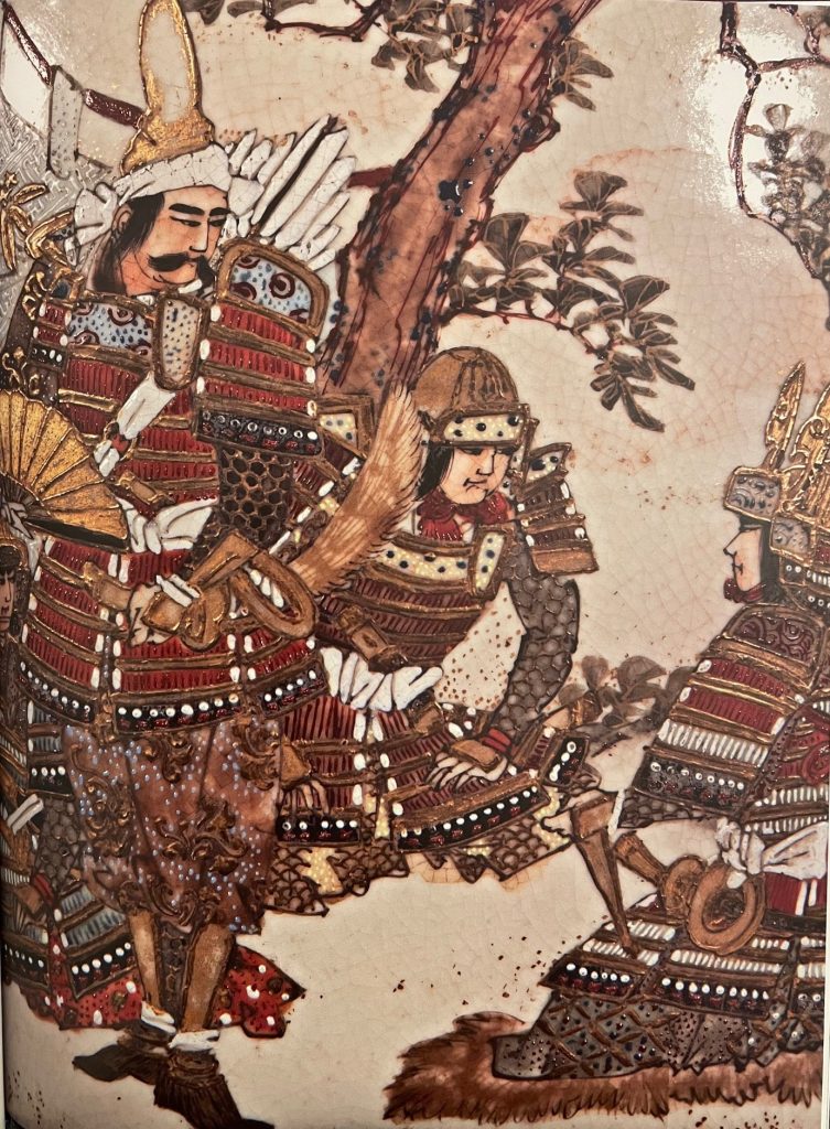 On the side of the vase, particular attention is drawn to the fan held by the male figure, on which a red circular sun is depicted. This motif began to be used as an emblem on Japanese commercial ships in 1870 and later became the symbol of the Japanese national flag in 1930.