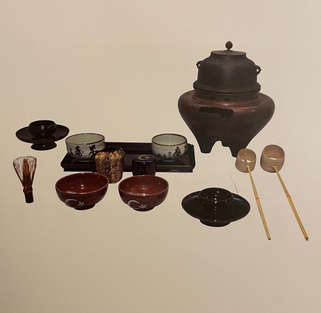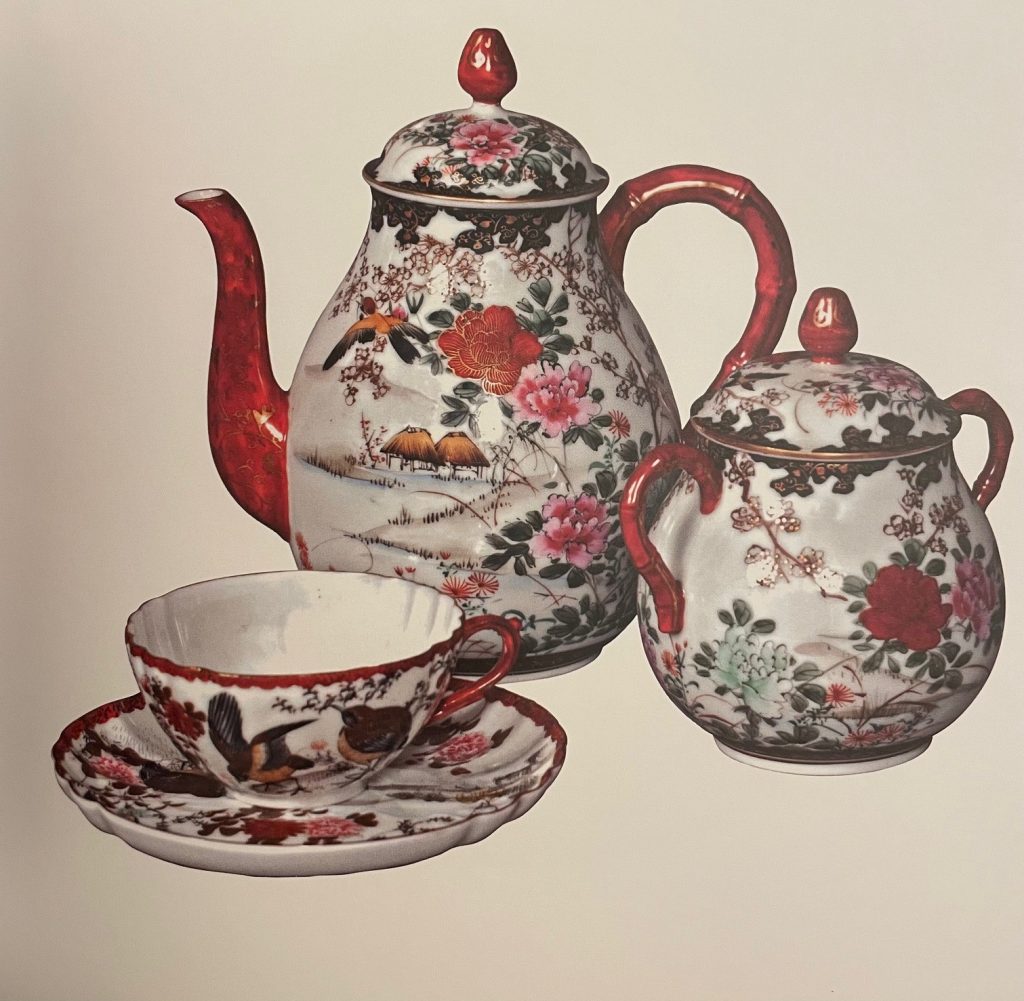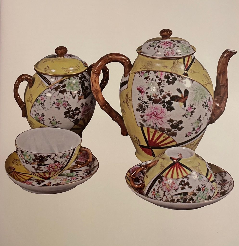 Japon ihracat ürünü olan ve çok ince porselenden yapılmış çay takımı, 22 parçadan oluşur. Çay takımının parçaları üzerinde Japon yelpazesi içine beyaz zemin üzerine kırmızı, yeşil, pembe, mavi gibi çeşitli renklerde çiçek, kuş figürleri, altın yaldızla yılan boğanak kuşu ve kelebek figürleri, stilize edilerek betimlenmiştir. Kulp kısımları bambu ağacı görüntüsü veren sırlı porselenden yapılan çay takımını oluşturan parçaların altında Dai Nihon – Büyük Japonya ve Madea Zo – Made in Japan yapımı yazılıdır.