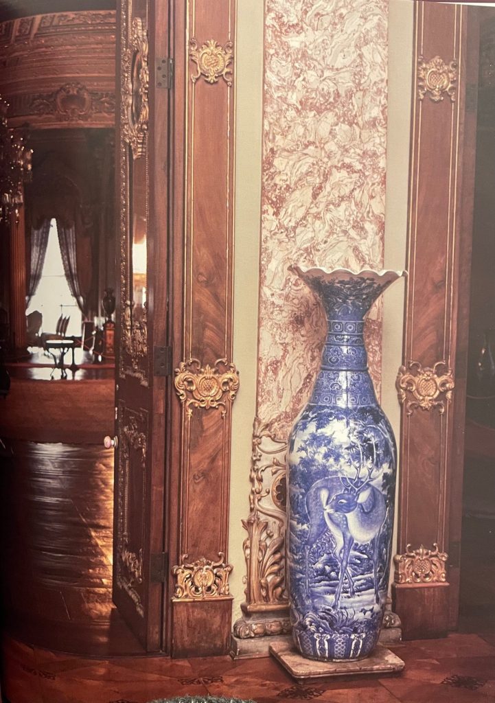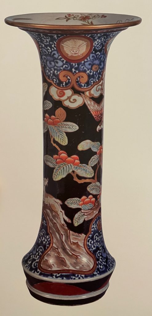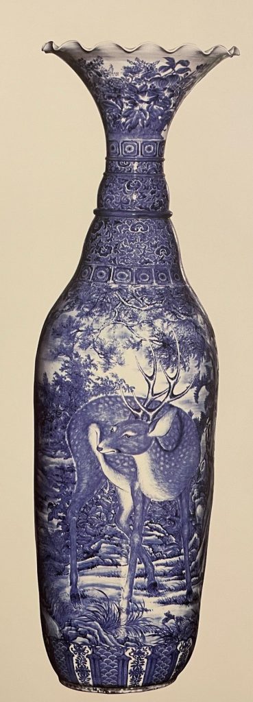 Milli Saraylar Koleksiyonu’nda bulunan büyük boyutlu, sıraltı tekniğinde yapılmış mavi-beyaz Arita porseleni vazo, ihracata yönelik sanat ürünüdür. Dip ve boyun kısmında geleneksel Japon desenleri kullanılırken, gövdesinde ise Batı sanatında beğenilen orman betimleme ve geyik figürü yer alır. Çizgisel perspektif kullanımı, renklendirmedeki “chiaroscuro” (koyu ve açık rengi ile gölgelendirme) tekniği, dönemin Avrupa sanat eğitimini dikkate aldığını göstermekle beraber, orman betimlemesinin klasik Japon resim ekolü olan “kano okulu”nu andıran çizgide olması, geçiş dönemindeki Japon resim özelliklerinin vazo yüzeyinde uygulandığını göstermektedir.