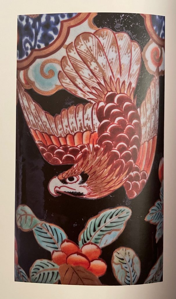Executed in black, red, blue, green, and gilt, this vase displays characteristic features of Arita craftsmanship. The surface of the vase is decorated with a dynamic composition depicting an eagle hunting a fleeing rabbit, accompanied by the sakaki flower, a botanical motif regarded as the “king of flowers” in both Chinese and Japanese traditions. The energetic interplay between the figures and floral elements enhances the sense of movement and symbolic richness of the composition.