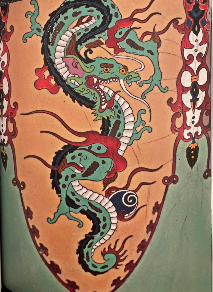 Yuvarlak kaideli, silindir formlu vazo yüzeyinde, Urashima efsanesinden sahneler betimlenmiştir. Vazonun etrafını saran ejderha figürü ve arka planda bulunan mimari tasviri, Urashima efsanesindeki Prenses Otohime’nin sarayı Ryūgūjo’yu işaret etmektedir. Japonca Ejderha Sarayı anlamına gelen Ryūgūjo, deniz altında olduğuna inanılan bir nevi ütopyadır.