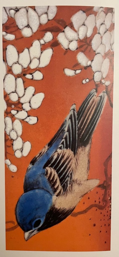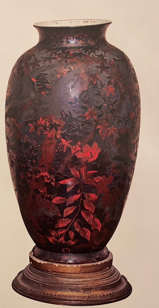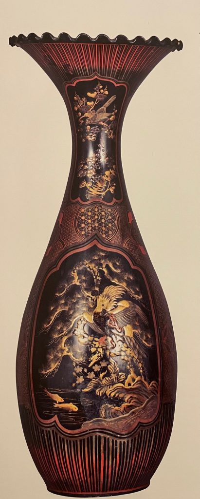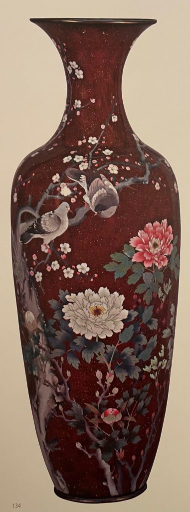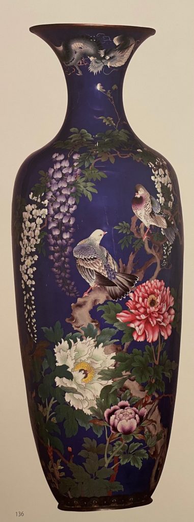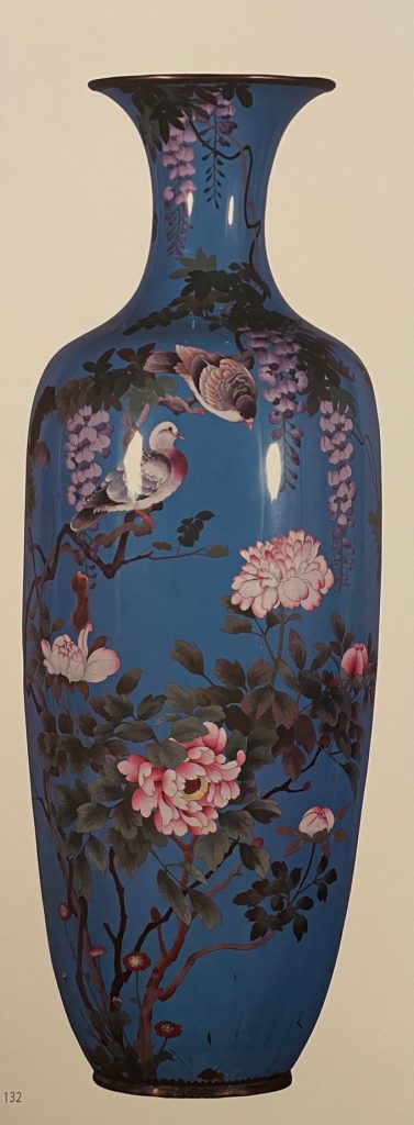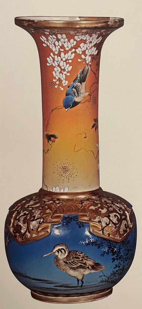 Art Nouveau akımının Japon yorumu olarak tasarlanan vazo, silindir formludur. Turuncu, turkuaz zeminli olup kuş figürleri ve beyaz salkımlarla betimlenmiştir. Altın yaldız kullanılarak oluşturulan kıvrımlar, vazo yüzeyine aplike edilerek uygulanmıştır.