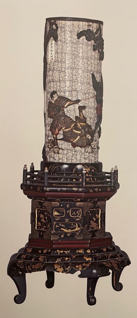 Japon lake işi ahşap kaide üzerinde yükselen gaz lambası, silindirik formdadır. Lambanın fildişi zemininde görülen samuray figürü hareketli bir kompozisyonla betimlenmiştir. Gövde üzerindeki imzalama Meiji Dönemi’nin ünlü heykeltıraşı Ishikawa Mitsukai’ye ait olduğu anlaşılan eser, Ishikawa eyaletinde yapılmıştır. Ishikawa eyaleti, özellikle Kutani işi, tekstilde Kaga Yūzen ile beraber Japon lake işinin önemli parçası olan Wajima Nuri işinin üretim yeri olarak da bilinir.