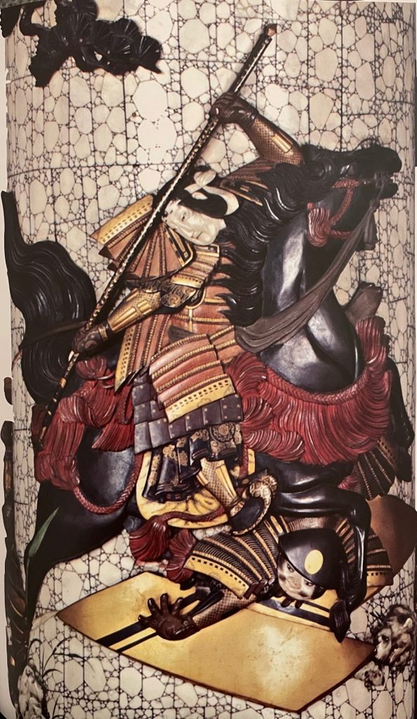 Eserin kaide kısmında, siyah lake üzerine kırmızı fırça ile yazılan Kirino Toshaki, Saigō Takamori, Rijūkichi Gassoku, Konsey ve Kara Kuvvetleri Generali; Saigō Takamori isimleri mevcuttur. Bu isimlerden Kirino Toshaki (1838–1877) ve Saigō Takamori (1828–1877), Satsuma (günümüzdeki Kagoshima) Bölgesi’nden Meiji Hükümeti’nin en önemli kurucularındandır.