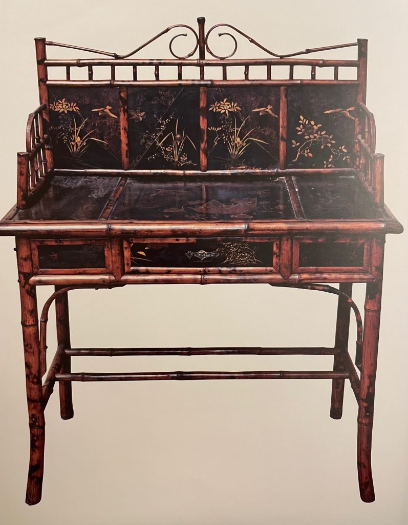 Dolmabahçe Sarayı Kadın Efendiler Dairelerinin tefrişinde bulunan bambu mobilyalara bir örnektir. Bambu malzemeden oluşan yazı masası yüzeyinde maki-e tarzındaki lake tekniği ile yapılmış tasvir bulunur. Yazı masasındaki siyah zeminli panolar üzerinde görülen resim detayları birbirinden farklı özellikler yansıttığı için Meiji Dönemi sonu–Taishō Dönemi başlarında ortaya çıkan prefabrik seri üretimin ürünü olduğu kuvvetle muhtemeldir. Bulunduğu mekâna sıcak bir hava veren bambu mobilyalar, özellikle Harem’de de kullanıma alanı bulmuştur.