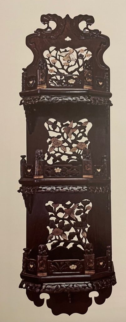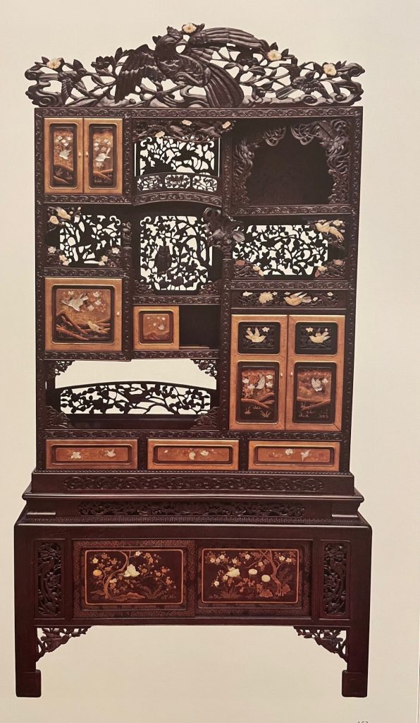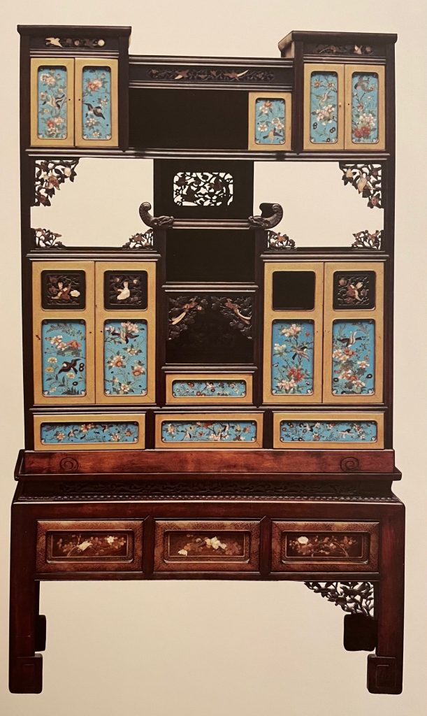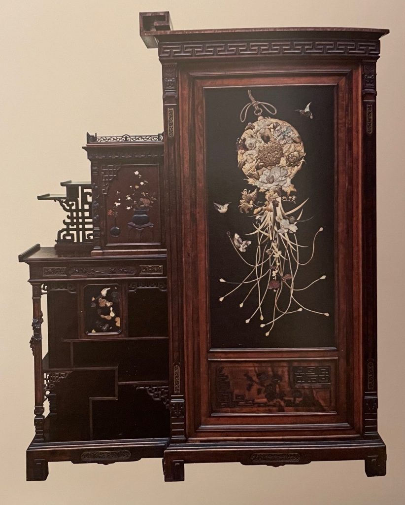 Boyutları farklı raf ve kapaklı dolabın birleştirilmesinden oluşan mobilya, Milli Saraylar Koleksiyonu’nda bulunan Shibayama işinin zengin örneklerinden biridir. Dolap yüzeyinde görülen, “kusudama (çiçek topu)” içinde sakaki, krizantem, ortanca ve gül gibi çiçek motifleri; fildişi, sedef çeşitleri, mercan, yeşim taşı ve altın yaldızlı malzemeler kullanılarak yapılmıştır. Japon lüle sedef kakma tekniğinde siyah zemin üzerine yapılan kusudamadan sarkan ipek kurdeleler Japonizm etkisi hissettirilmektedir. Bordürü ve sütun başlıklarındaki klasik dolap kapısındaki kabartma ise Çin işi süslemelerdendir.