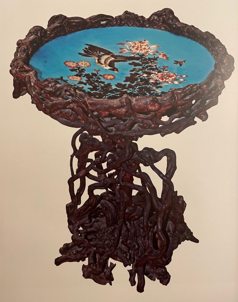 Natural sarmaşık ağaç formundaki ayak üzerinde yükselen masa, yuvarlak formludur. Tipik “Owari” (Aichi) Bölgesi shippō özelliği gösteren masa tablası turkuaz zemin üzerinde görülen krizantem çiçeği, kartal ve kuş figürü ile birlikte betimlenmiştir.