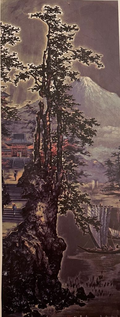 The use of linear perspective and the application of chiaroscuro—the modeling of form through light and dark shading—indicate an awareness of contemporary European art education. At the same time, the treatment of the forest scene, executed in a manner reminiscent of the Kano school, a classical Japanese painting tradition, demonstrates how characteristics of transitional-period Japanese painting were adapted to the surface of the vase.