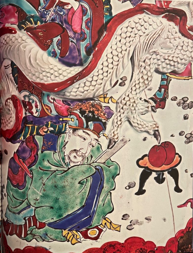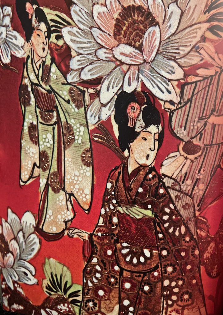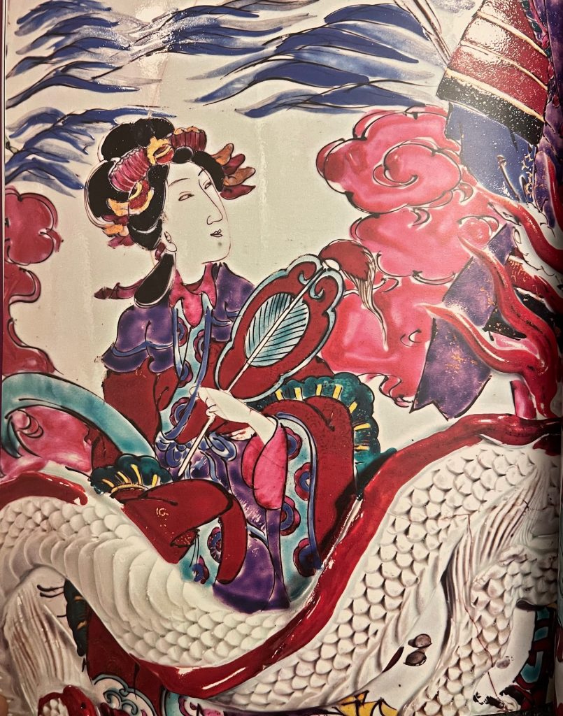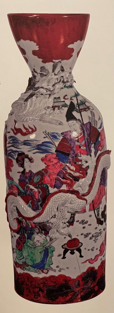 The vase features a dominant palette of red and dark blue, complemented by yellow and green tones. Its surface is decorated with motifs rendered in relief technique, including a pair of cranes depicted beneath a pine tree, along with chrysanthemum, plum, and bamboo—plants that symbolize good fortune and longevity in both Japanese and Chinese traditions. On the opposite side of the vase, a nobleman is depicted within a bamboo forest, accompanied by a servant carrying his belongings. The blooming orchid portrayed beside the nobleman symbolizes aristocracy and intellectual refinement. The gentleman represented on the vase is thought to embody the Bunjin literati, who, in Chinese tradition, are regarded as the ideal of the intellectual elite.