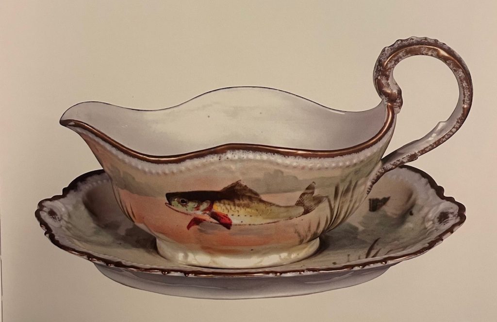Fransız Limoges porseleninden yapılmış salçalık, ağız kenarı ve kulp kısmı altın yaldızlı olarak narenci ve çiçek motifleriyle şekillendirilmiştir. Ağız kenarlarının iki dizili içe çevrilen rokoko kıvrımları ile kompozisyonunda Japonizm akımının etkisini hissettiren balık figürü, naturalist üslupta görülen manzara ile resmedilmiştir.