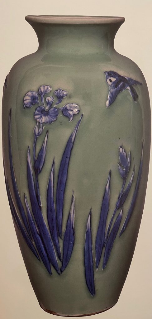 Zemini tirşe renkli vazoda, mavi renkte susam çiçekleri ve kuş figürleri kabartmalı olarak tasvir edilmiştir. Vazo, Avrupa’da yaygın olan Japonizm etkisinin izlerini taşır.
