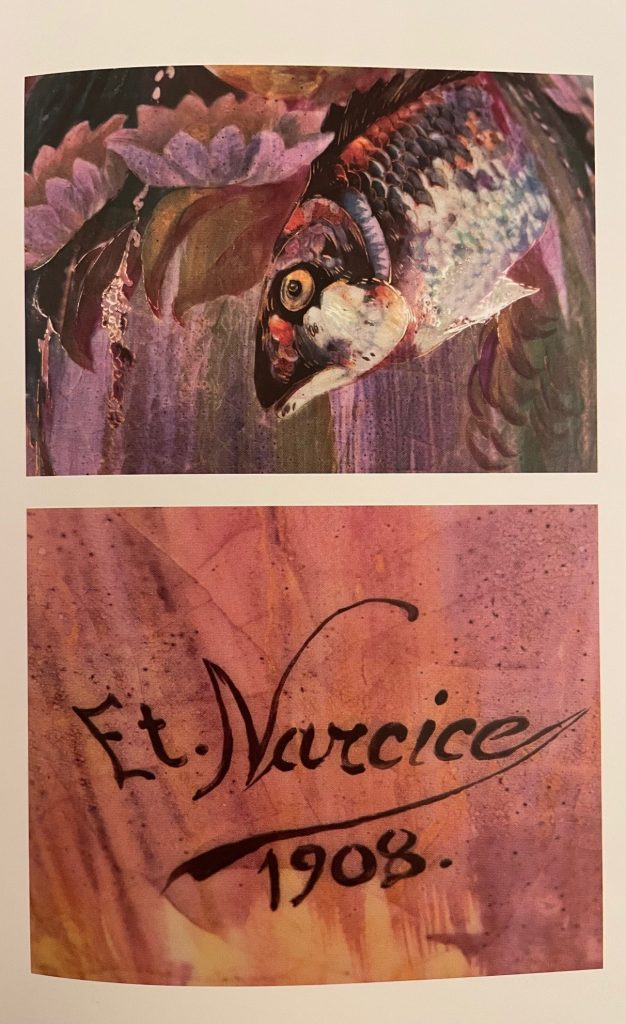 Sağ sütun başlığının altındaki küçük ynak tabanı altındaki küçük kulp buradadır. Çin etkili olup altın yaldızlı bordürde ise Antik Yunan ve Çin’de bulunan, Asya’da da yaygın olan “karakasa (hanomel)” motifi kullanılmıştır. Japonizm etkili dolap kapısında G. Viardot Paris 1887 ibaresi yer alır.