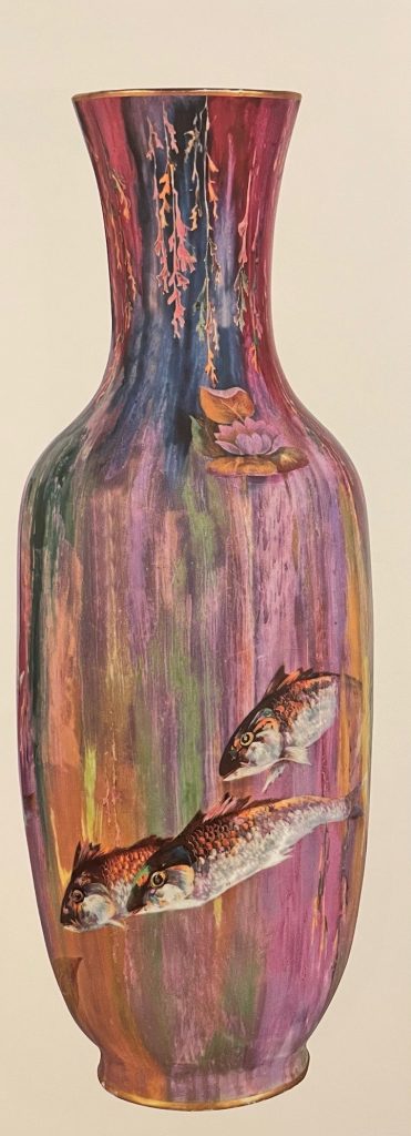 1908 tarihinde Yıldız Porselen Fabrikası’nda üretilen vazo, A. Narcice imzalıdır. Dip kısmında Yıldız Porselen Fabrikası’nın damgası bulunan, silindir formlu, lila, yeşil, koyu pembe zeminli vazonun gövdesinde sazan balıkları ve nilüfer çiçekleri resmedilmiştir. 19. yüzyılın ikinci yarısında Avrupa’da yaygın olan Japonizm akımının 20. yüzyıl başına tarihlenebilen bir örneği olarak değerlendirilen Yıldız porseleni vazo, koleksiyondaki Japonizm etkili az sayıdaki örneklerden biridir.