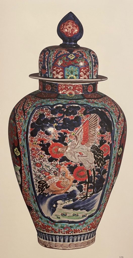 This vase is an example of the Arita porcelain type known as “Jinko-tsubo,” characterized by its lidded form, high mouth, broad shoulders, and a body that tapers toward the base. Today primarily used for decorative purposes, the Jinko-tsubo originated from the tradition of offering pleasant fragrances to guests. Rare and fragrant pieces of wood imported from Southeast Asia were stored in such lidded vessels. Possessing a Jinko-tsubo was regarded as a sign of wealth and power within the household, a status further emphasized by its large scale and richly ornamented design. Originally intended for storage, these vessels were later adopted as decorative objects.