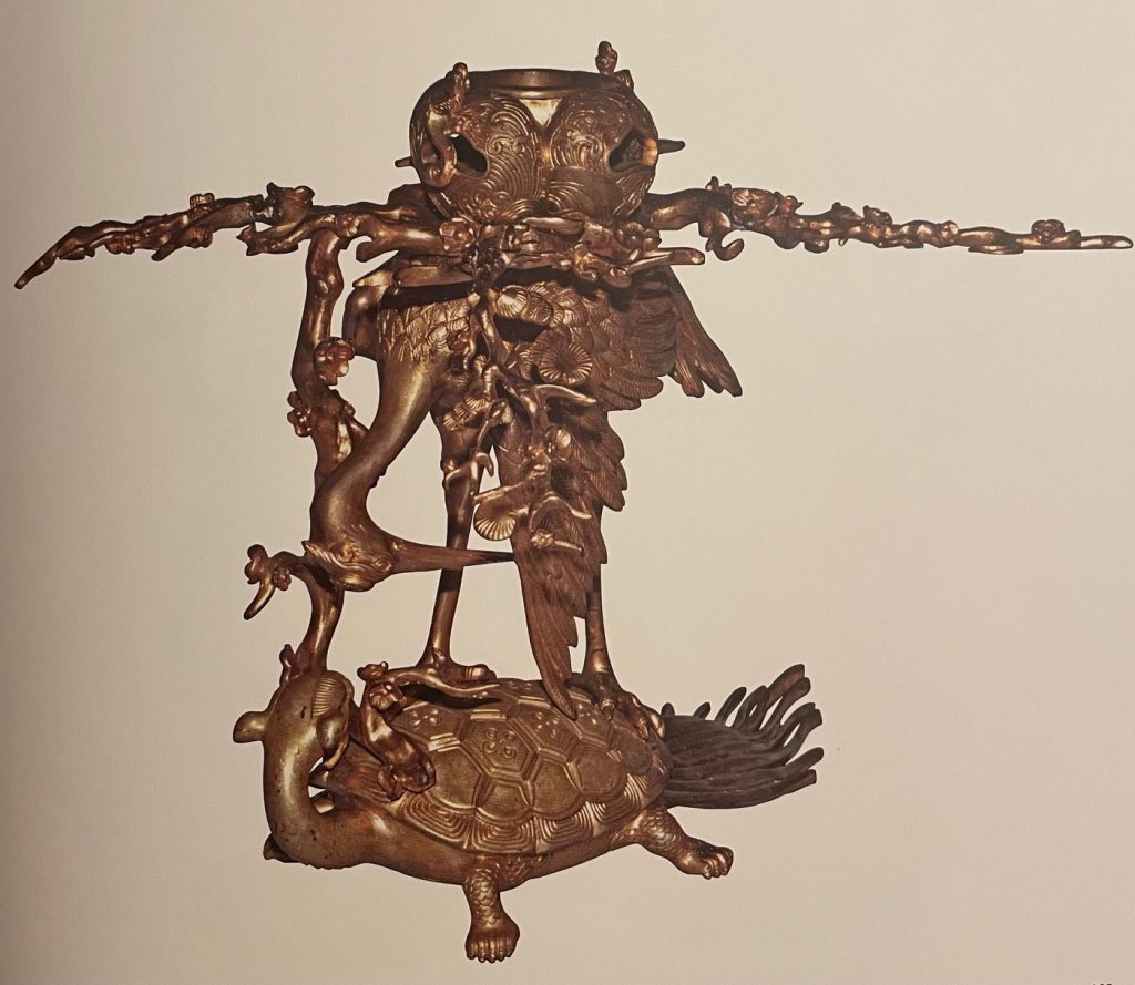 Döküm bakırdan, altın yaldızla yapılan mumluk; turna kuşu, kaplumbağa figürü, çam ağacı ve erik çiçeği gibi çeşitli motiflerle belirgin Japon etkisi gösterir. Dip kısmında Escalier de Cristal–Paris imzası bulunan eser, Fransız Escalier de Cristal firmasının ürünüdür. 1802’de Veuve Desarmé tarafından kurulan firma, kristal ve bronzun birlikte uygulandığı objelerde imzasıyla tanınmış, birkaç kez el değiştirerek 1923’e kadar devam etmiştir. Bu tip eserler Escalier de Cristal’de 1894’te yapıldığı için, bu obje de 1894 ve sonrasına tarihlendirilebilir.