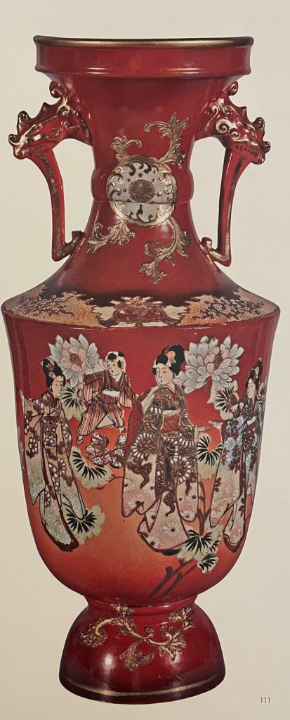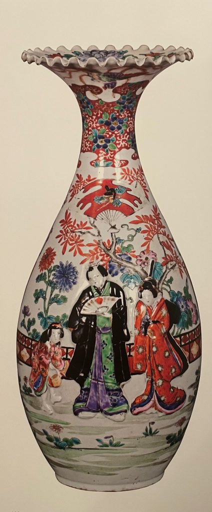 The surface of the vase is decorated with figures of boys and girls wearing “furisode”-type kimono, their hair styled in the traditional momoware fashion, accompanied by chrysanthemum motifs. The overall form of the vessel closely resembles that of French vases, reflecting the adaptation of Japanese ceramic production to Western tastes for the export market.