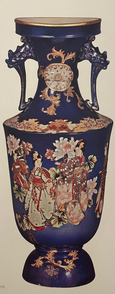 This export vase, featuring two handles arranged symmetrically and finished in a dark blue ground, displays characteristic features of Kyō-Satsuma ceramics through the combined use of relief decoration, painted ornamentation, and gilt detailing.