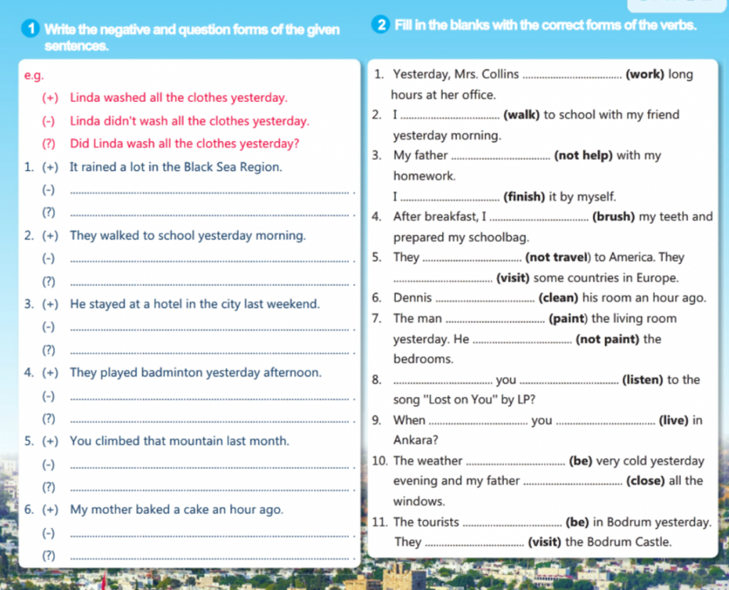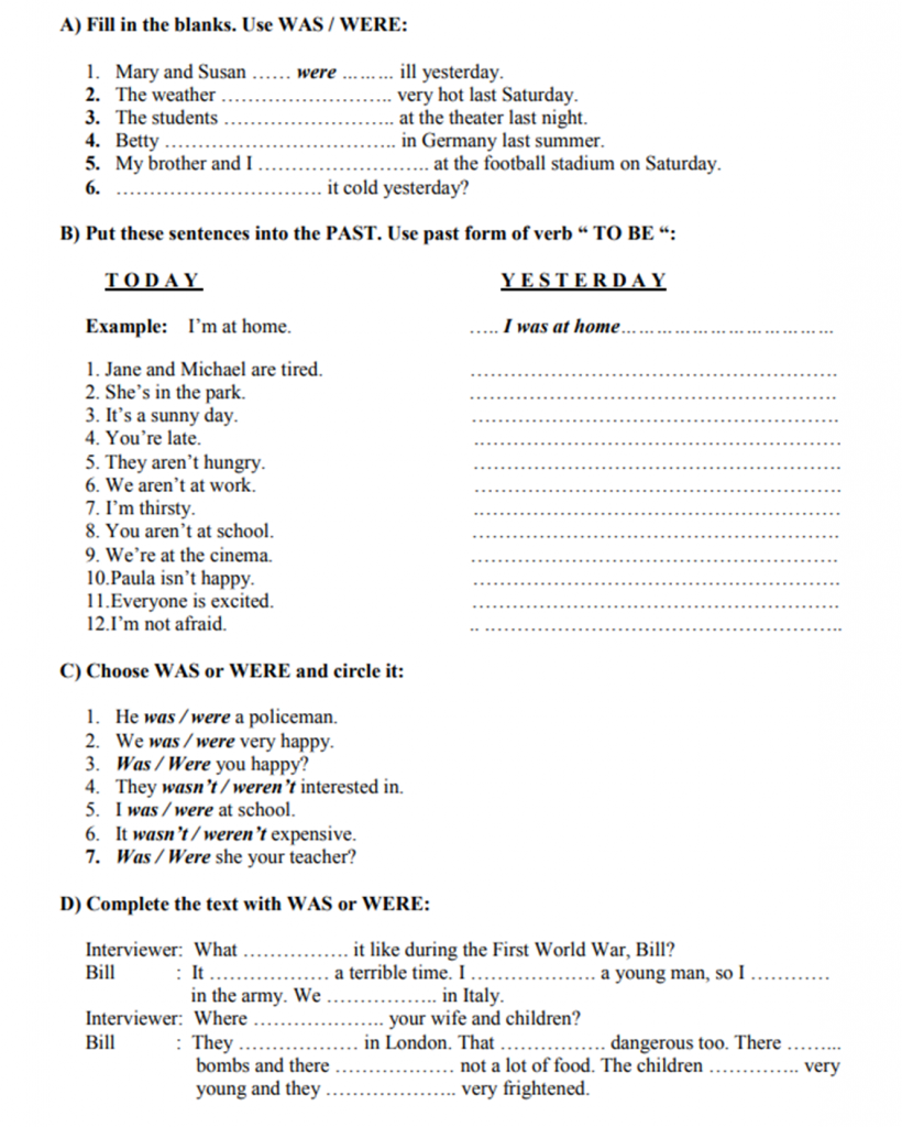 Last year I went (go) on holiday. I ……………… (drive) to the sea with my friend. On the first day we ……………… (look) at the beautiful buildings and ……………. (eat) in lots of restaurants. The next day ……………… (be) very hot so we …………….. (drive) to the sea. We ……………….. (leave) our clothes in the car and ………………… (sunbathe) and ……………. (swim) all day. At six o’clock we ……………. (walk) to our car, but the car ……………(be) there. We ……………… (buy) some clothes and ………………. (go) to the Police Station. The police ……………. (be) nice and we …………….. (sleep) in the police station.