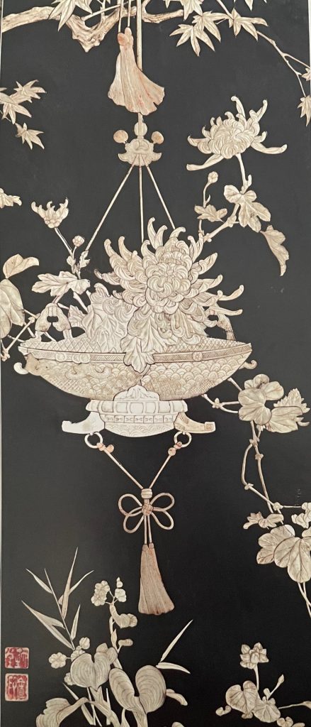 Floral motifs occupy a central position in Shibayama design and are often arranged in fluid, rhythmical groupings across objects such as vases, caskets, and decorative panels. Each flower was selected with intention, carrying associations tied to seasonality and symbolism: